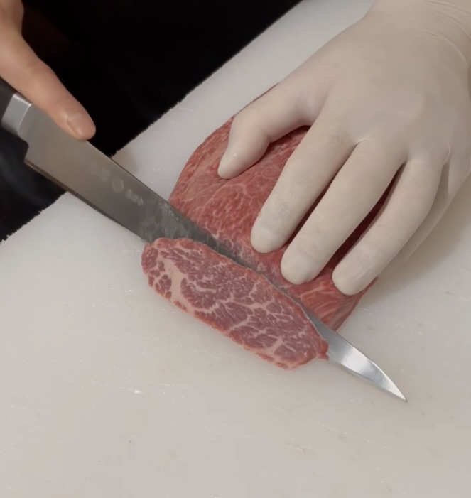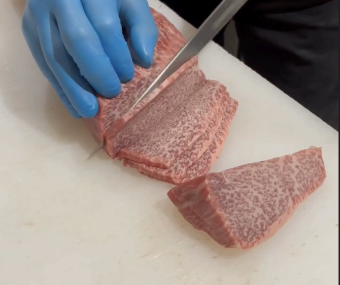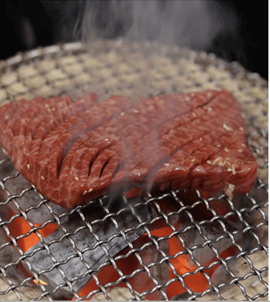 シンタマの中でも最も美しい霜降りを持つのがトモサンカク。繊細なサシが赤身の中に広がり、炭火で軽く炙ると脂がゆっくり溶け出します。