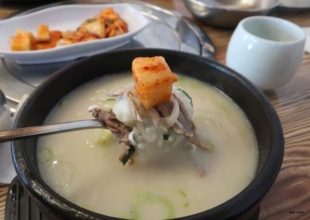 • ソルロンタン: 牛のゲンコツ(骨)などを長時間煮込んだ「真っ白な」スープ。韓国ではここにホホ肉を入れたり、キムチやカクテキで味変して楽しむのが一般的です。